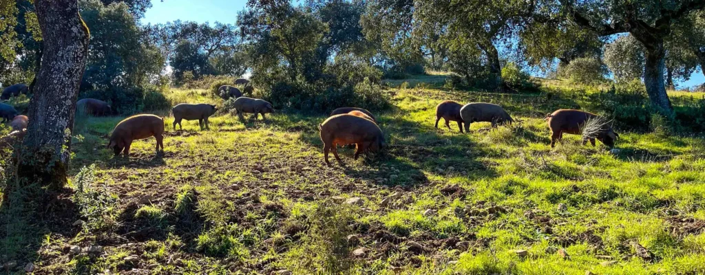La crianza en libertad es el pilar de todo lo que hacemos. Nuestros animales viven en un entorno ecológico privilegiado, rodeados de encinas, olivares y pastos silvestres. Su alimentación, basada en bellotas, castañas, leguminosas y recursos naturales de la dehesa, sigue un ritmo pausado, sin prisas ni procesos forzados.